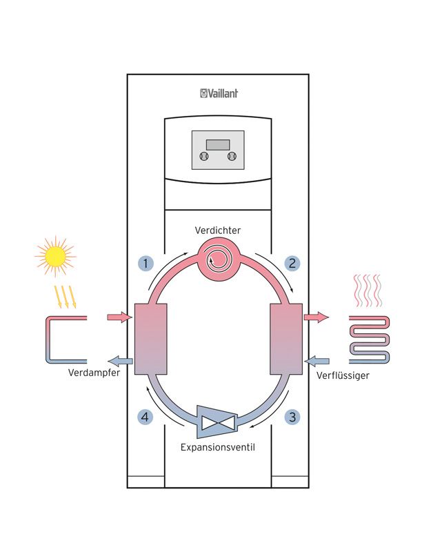 Die Wärmepumpe ist eine thermodynamische Maschine, in der ein Arbeitsmedium (Kältemittel) einem Kreislauf folgt. Das Arbeitsmedium ändert dabei seinen Aggregatszustand von flüssig auf gasförmig. Das Kältemittel hat die physikalische Eigenschaft, dass es bereits bei relativ geringen Temparaturen verdampft.