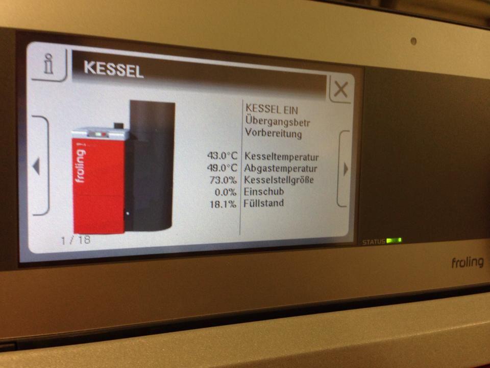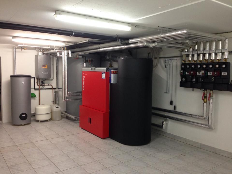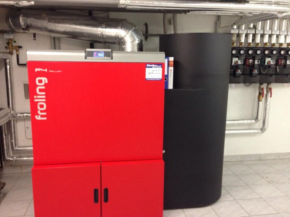 Pellet Kessel 100kW zur Beheizung mehrerer Gebäude mit Warmwasserbereitung